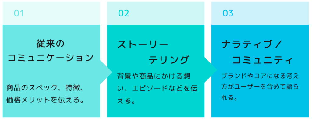 ストーリーテリングとは、その商品の本質的な魅力や、商品を作ることになった背景などをストーリーとして伝えることで、顧客に共感を持ってもらう手法です。近年、ECサイトやD2C(Direct to Consumer)と言われる領域ではこのストーリーテリングなコンテンツ(またはさらに踏み込んだ「ナラティブ」という概念)が重視されており、自分たちの想いや物語を発信し続けることでその商品に情緒的価値を付加し、機能性や価格だけでは動かない層に訴えかけていくことがマーケティング成功の一つの鍵となっています。